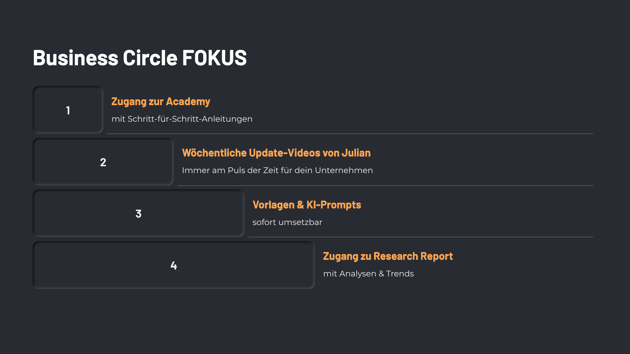 Im Business Circle FOKUS bekommst du nicht nur Theorie, sondern Julians direkten Blick auf Strategien, die heute funktionieren. Von klaren Strukturen bis zu KI-gestützten Frameworks: alles, was du brauchst, um dein Business vom Freelancer-Level auf ein Unternehmer-Fundament zu heben.