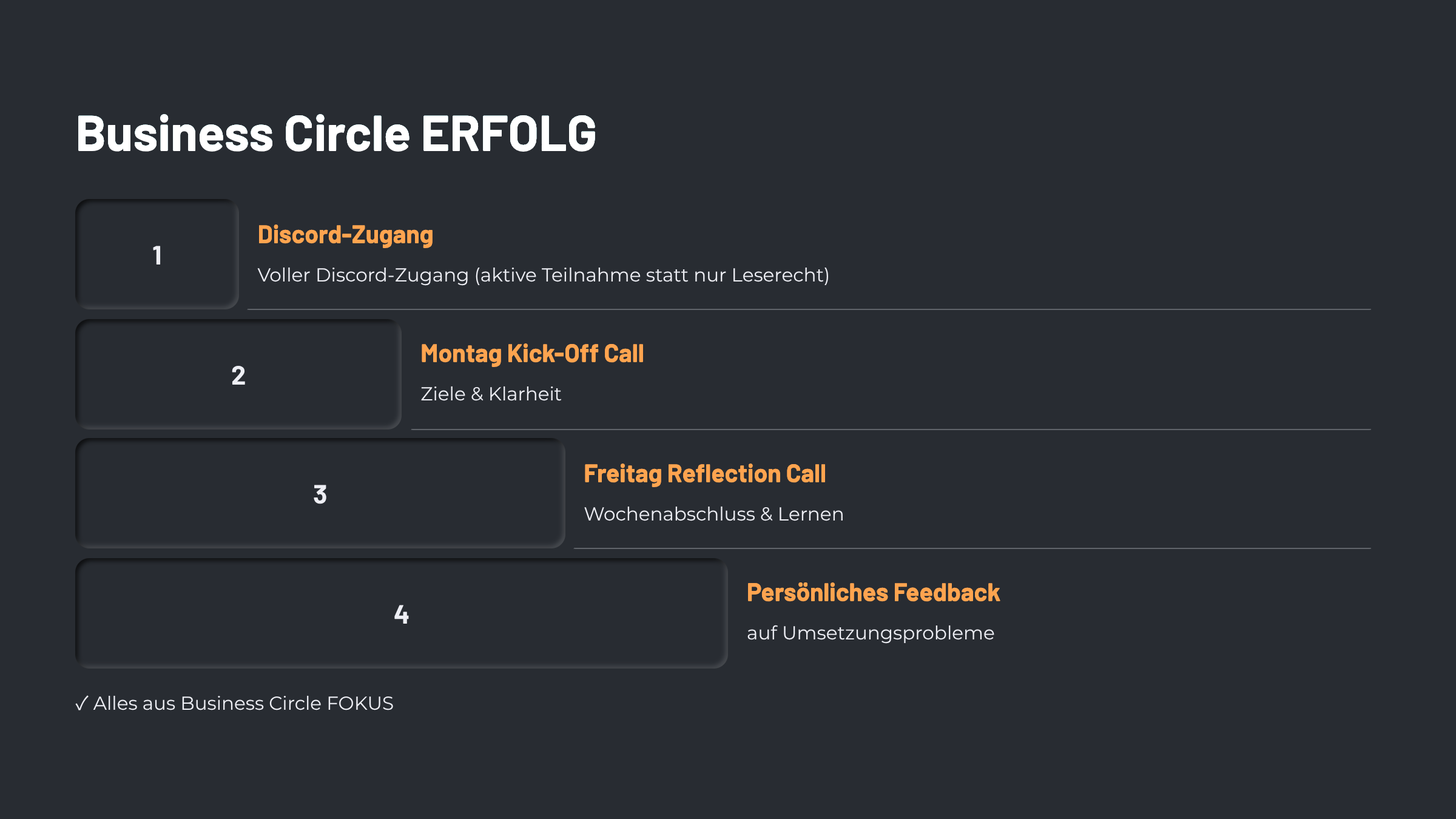 Der Business Circle ist ein mehrstufiges Unternehmer-Programm mit Community, Calls und Inhalten. Ziel ist es, dich von Chaos zu Klarheit und von Selbstständigkeit zu echtem Unternehmertum zu bringen, je nach Level (FOKUS, ERFOLG oder ELITE).