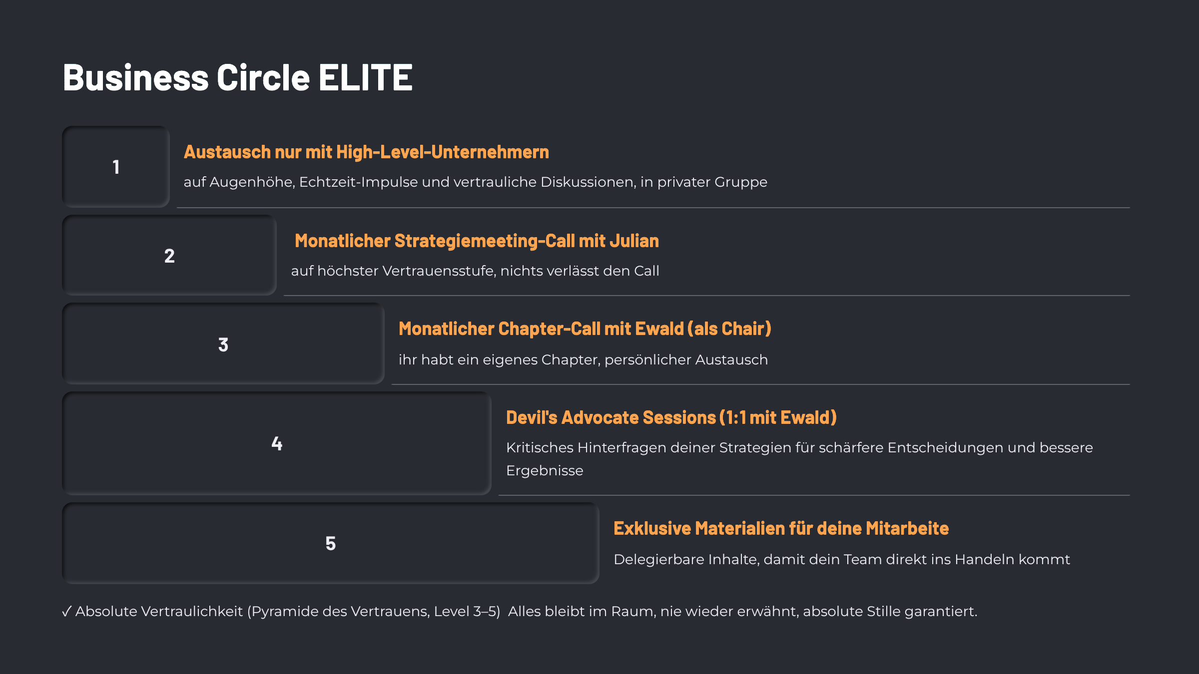 Im ELITE triffst du auf Unternehmer, die dein Level kennen. Exklusive Mastermind, Strategiemeetings mit Julian und vertraulicher Austausch in geschlossener Runde.